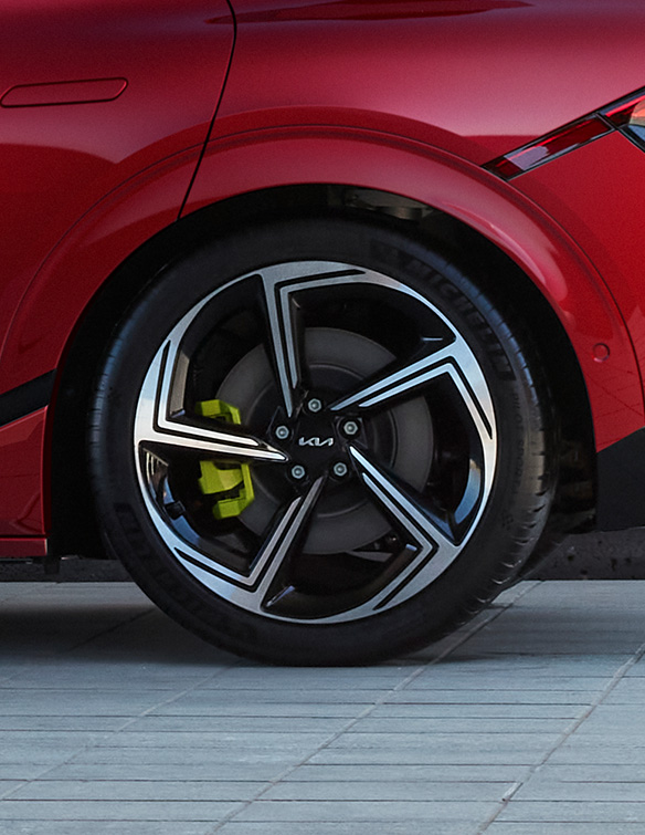 Charakteristisch für das Design des EV6 GT sind die speziellen 21-Zoll-Leichtmetallfelgen, die mit ihrem detailreichen, sportlich inspirierten Look für noch mehr visuelle Präsenz sorgen. Ergänzt werden sie durch neonfarbene Bremssättel, die perfekt zu den eleganten Neon-Akzenten im Innenraum passen.
